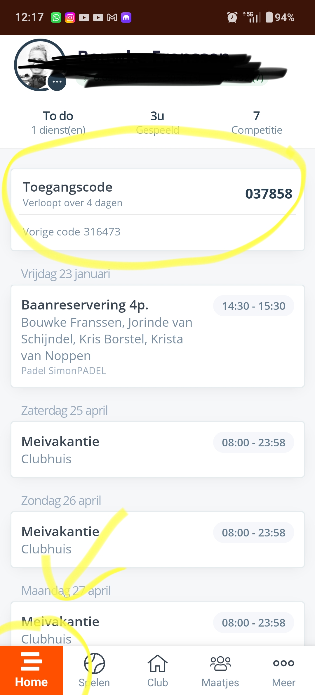 Gebruik je code (KNLTB Club app) voor de ingang beneden. Zie hieronder.